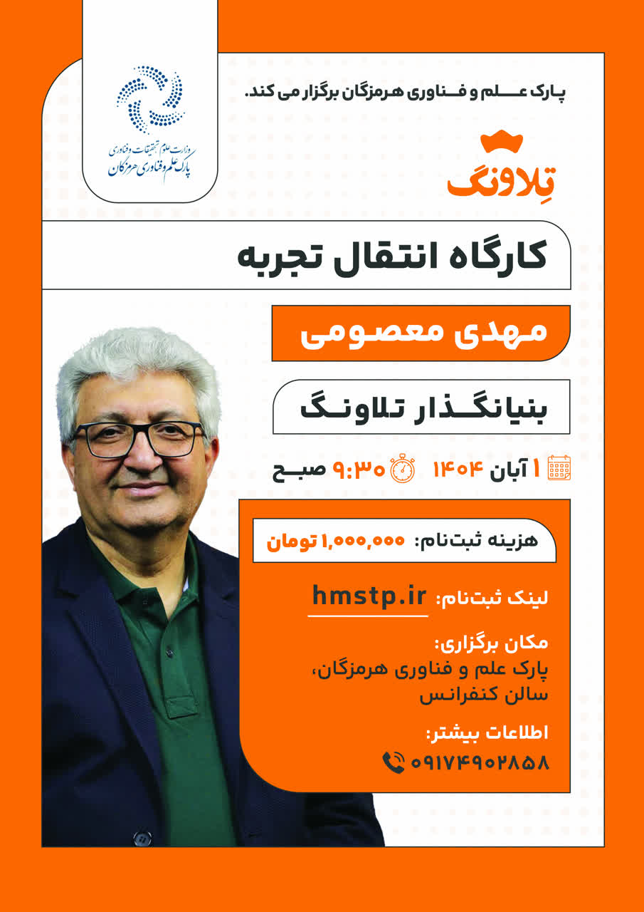 مرکز رشد واحدهای فناور پارک علم و فناوری هرمزگان کارگاه آموزشی با عنوان "انتقال تجربه" را با حضور آقای مهدی معصومی، بنیان‌گذار و مدیرعامل شرکت تلاونگ، برگزار می‌کند. این کارگاه با موضوع "واکاوی راه‌های شکل‌گیری کارآفرینی" به‌عنوان ابزاری مؤثر برای ارتقای عملکرد کارآفرینان نوپا، در تاریخ ۱ آبان ۱۴۰۴ در محل پارک علم و فناوری هرمزگان برگزار خواهد شد.