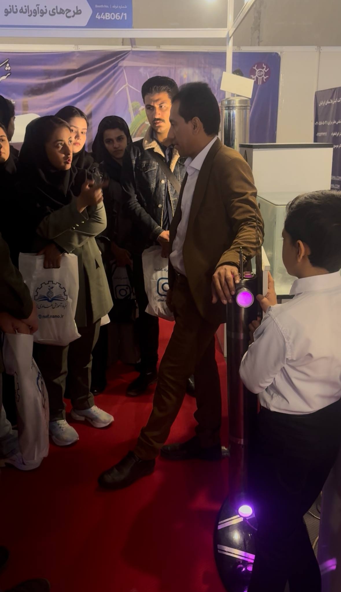 در بخش دیگری از بازدید، آقای جابر سادگی—مدرس نمایشگاه، رابط نهاد ترویجی نانو در هرمزگان، دارنده مدال طلای مسابقات ملی فناوری نانو و فارغ‌التحصیل دانشگاه هرمزگان—به‌عنوان راهنمای علمی همراه گروه بود و با معرفی تخصصی غرفه‌ها، مسیرهای نوآوری و کاربردهای صنعتی فناوری نانو را برای دانشجویان تشریح کرد.