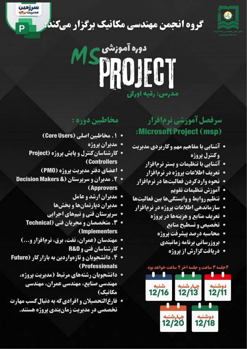 انجمن علمی مهندسی مکانیک دانشگاه هرمزگان دوره تخصصی آموزش نرم‌افزار Microsoft Project (MSP) را با هدف ارتقاء مهارت‌های مدیریت و کنترل پروژه برای دانشجویان و علاقه‌مندان به ورود حرفه‌ای به بازار کار برگزار می‌کند.