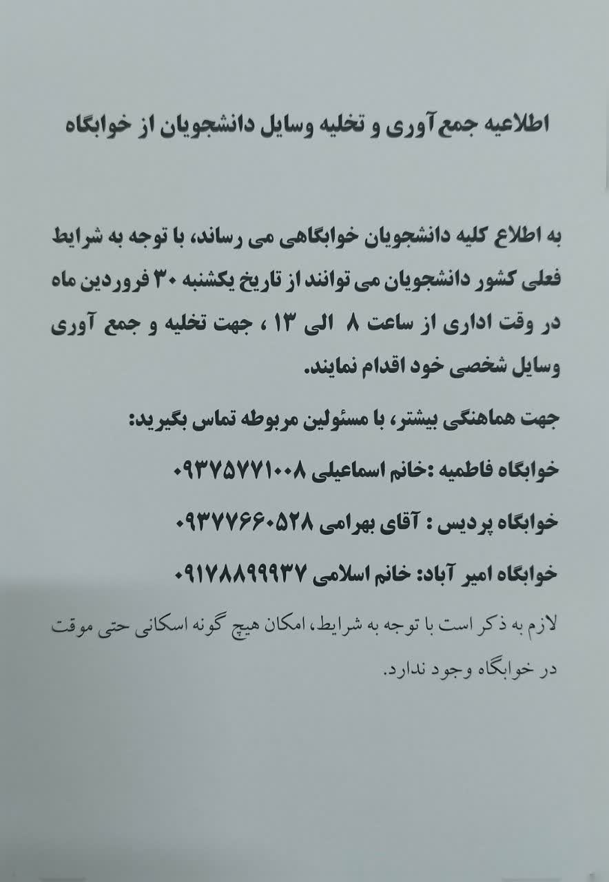 اطلاعیه جمع آوری و تخلیه وسایل دانشجویان از خوابگاه