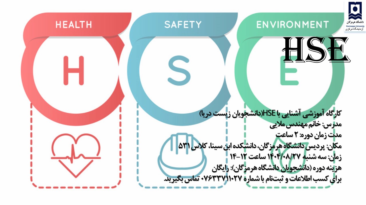 به اطلاع دانشجویان گرامی می‌رساند، آزمایشگاه مرکزی دانشگاه در راستای ارتقای سطح آگاهی و ایمنی در محیط‌های آزمایشگاهی، دوره آموزشی "ایمنی در آزمایشگاه (HSE)" را ویژه دانشجویان جدیدالورود برگزار می‌کند.